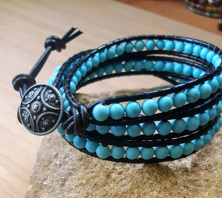Frosted Magnesite gemstones are woven onto black Greek Leather cord. Which is traditionally softer and more comfortable than most leathers. Bracelet measures about 22" long with additional three inches of adjustable closures. Finished off with a pewter button clasp. Shipping is always free within the U.S. Worldwide shipping is available.